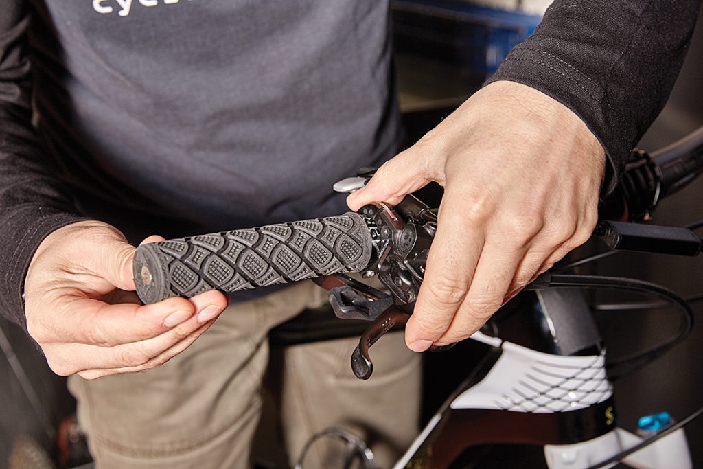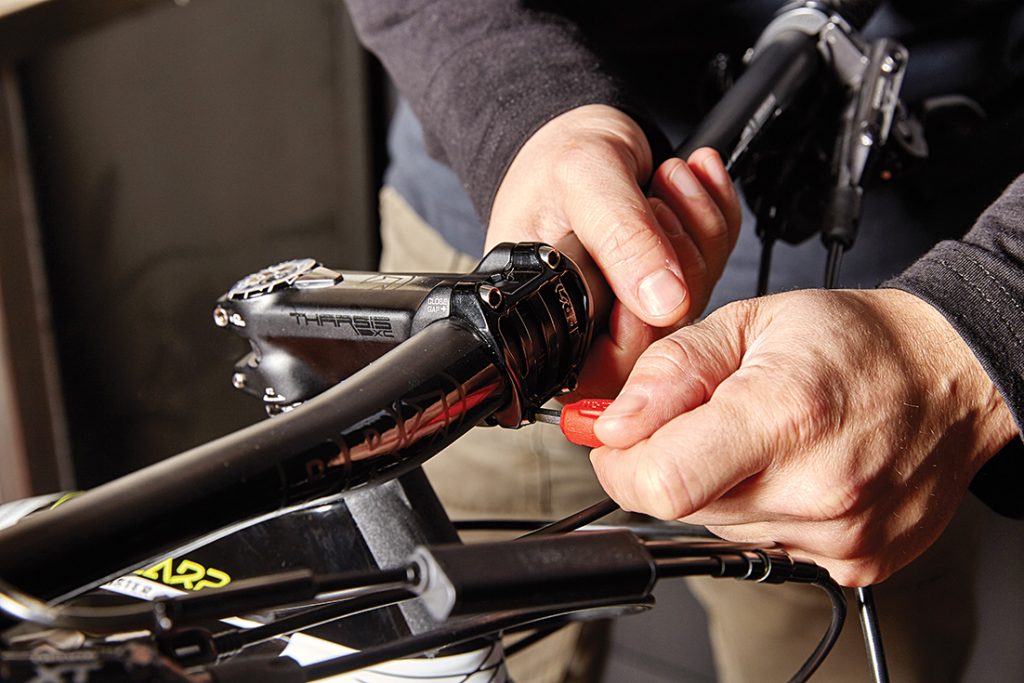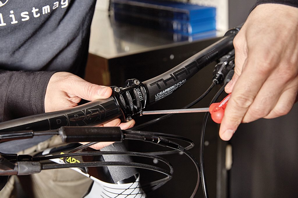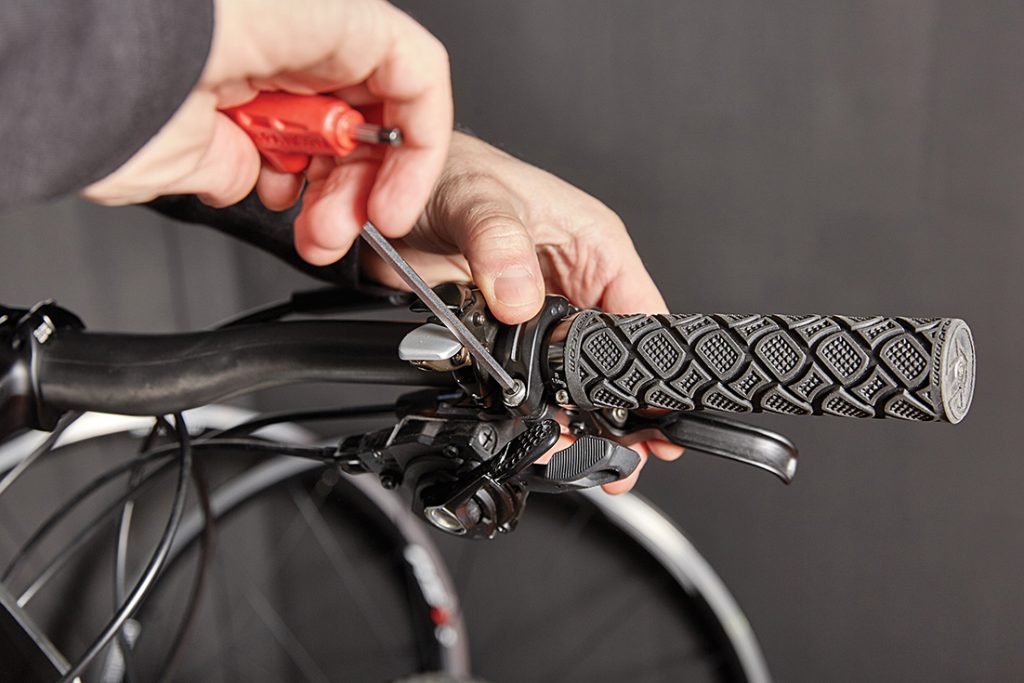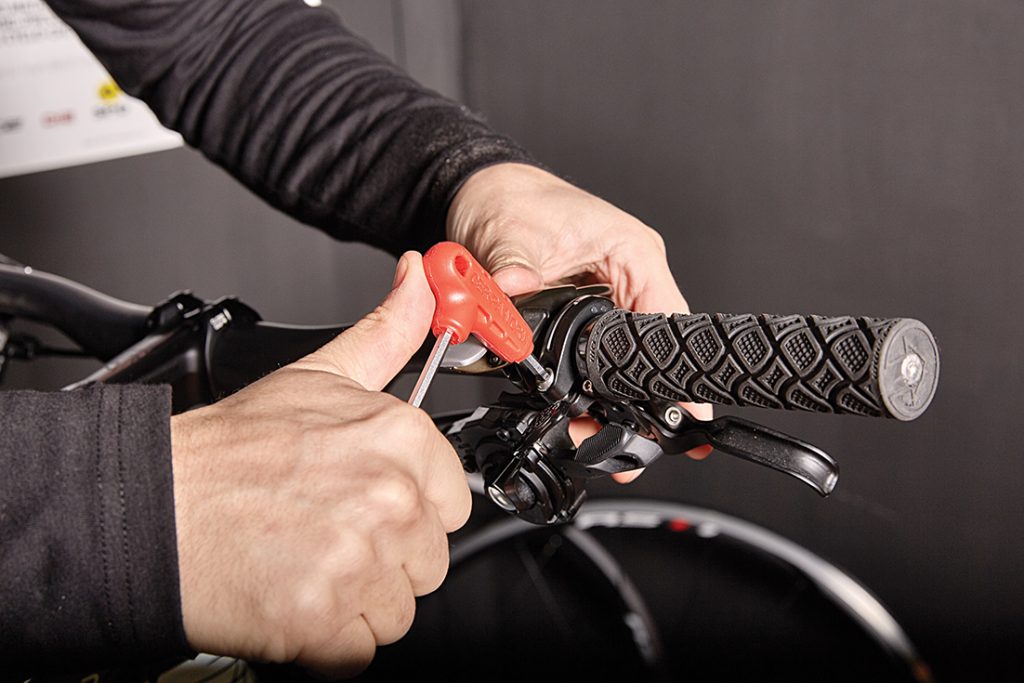 Gidonun açısını değiştirdiğimiz için fren ve vites kollarının açısı da değişmiş oldu. Bunları yeniden doğru biçimde ayarlamamız gerekli. Buradaki modelimizde Shimaono’nun XT modeli, tümleşik fren ve vites kolları bulunmakta. Bu durumda tek vidayı gevşeterek ayar yapabileceğiz. Öncelikle alyan anahtarla bu vidayı gevşetiyoruz