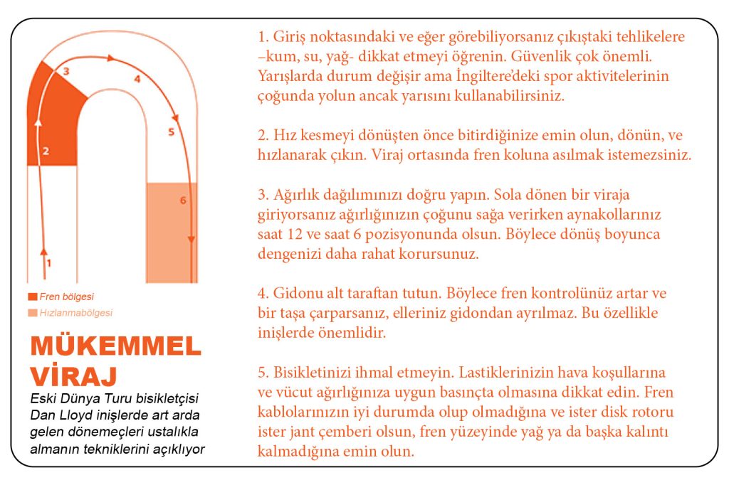 Bir dönüşe hızla girip de öbür taraftan nasıl çıkacağınızı merak ettiğiniz hiç oldu mu? Eski World Tour yarışçısı Dan Lloyd, mükemmel dönüşe hazırlanmanın olmazsa olmazlarını anlatıyor: “Ne kadar keskin bir dönüş olduğunu hesaplamaya çalışın. Yolun gittiği yeri göremiyorsanız ağaçların dizilimine bakın ve her ne olursa olsun, kuru havalarda bile, drenaj kapaklarından uzak durun.”