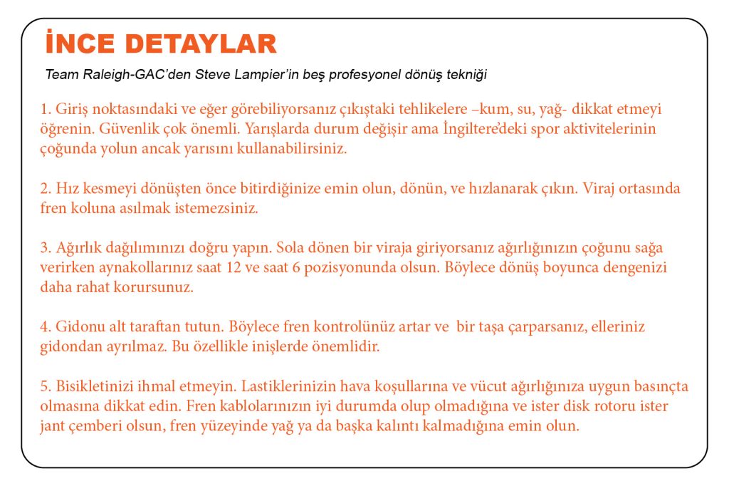 Lampier, doğru viraj almanın belki de en çok önem kazandığı  Tour Serisi gibi kriteryum yarışlarında çok tecrübeli. “İngiltere’deki kriteryum yarışlarında en büyük sorun yarışçıların birbirinin önüne dalması durumu. İnsanlar içeri doğru dalarken veya bir başka yarışçının önüne geçip yana yatarken fazlasıyla hızlı davranıyor. Kendini yüzde 100 yarışa verdiğin için bu aslında tehlikeli bir şey ama çoğu zaman işe yarıyor ve denedikçe daha iyi yapmayı öğrenebiliyorsun. Bir kriteryum yarışında aynı virajı 50 küsur kere dönüyorsun; dolayısıyla alışkanlıkla birlikte kendine güvenin geliyor.” Katıldığınız bir sonraki yurt dışı spor aktivitesinde, iniş sırasında bir bisikletçinin önüne dalarsanız başınızı derde sokarsınız; en azından önüne geçtiğiniz bisikletçiden bir araba küfür yersiniz. Ancak dönüşün ne kadar keskin olduğunu ve zamanı doğru okuduğunuz taktirde, kimseyi tehlikeye atmadan virajı ele geçirmek oldukça mümkün. Viraj alma becerisini nasıl geliştireceğinize gelince, Batchelor “Bulunduğunuz bölgede sakin bir yol bulun ve çeşitli dönüşler üzerinde çalışın” diye öneriyor, “Farklı hız ve açılarda keskin virajlar, kısa virajlar, sola dönüşler ve –eğer güvenliyse ve görüş mesafesi netse- sağa dönüşler.”