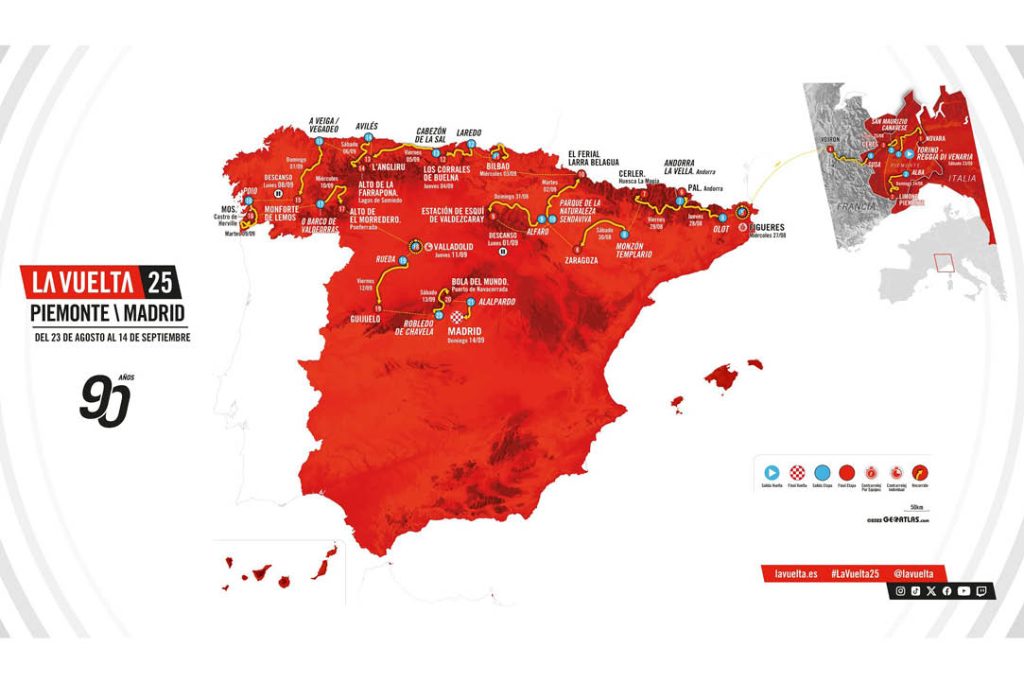 2025 Vuelta a España, Fransa ile Alpler sınırının hemen doğusundaki İtalyan bölgesi olan Piemonte’den başlayacak. Gran Salida, yarışın 90 yıllık tarihinde ilk kez İtalya’yı ziyaret etmesine tanıklık edecek. Buna ek olarak, ev sahibi bölge Piemonte, 2024’te Tour de France ve Giro d’Italia’nın bölgeden geçmesi ile iki yıl içinde üçüncü Büyük Tur başlangıcına da ev sahipliği yapmış olacak.