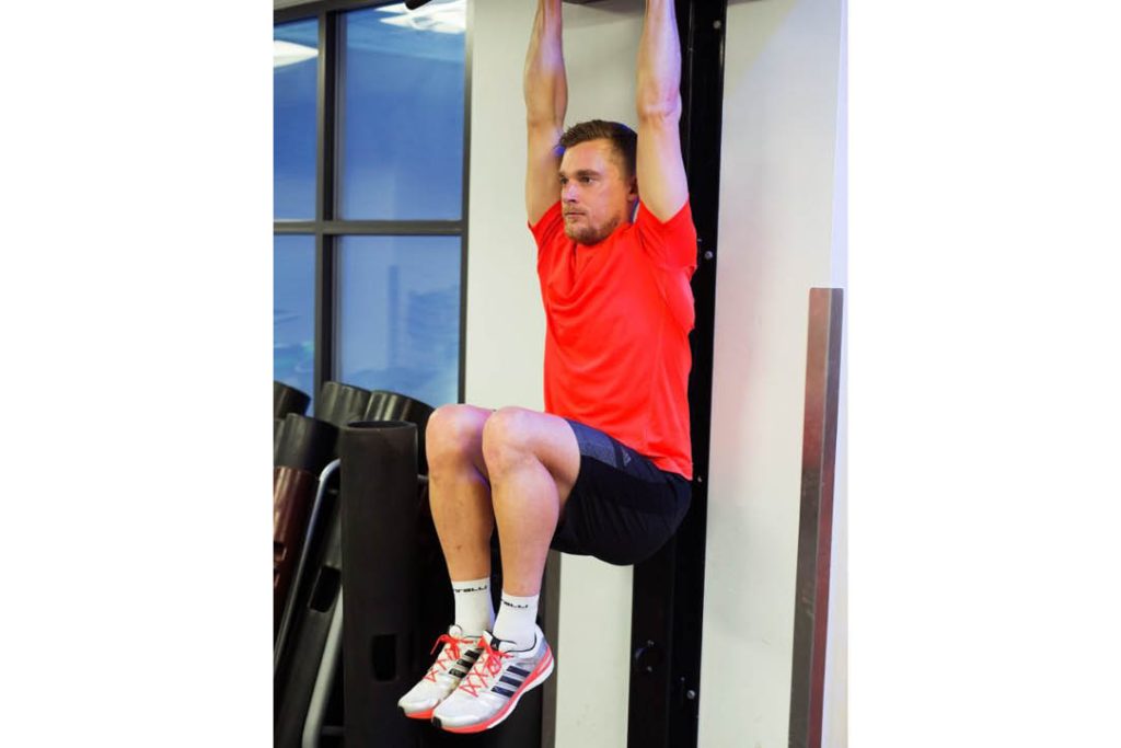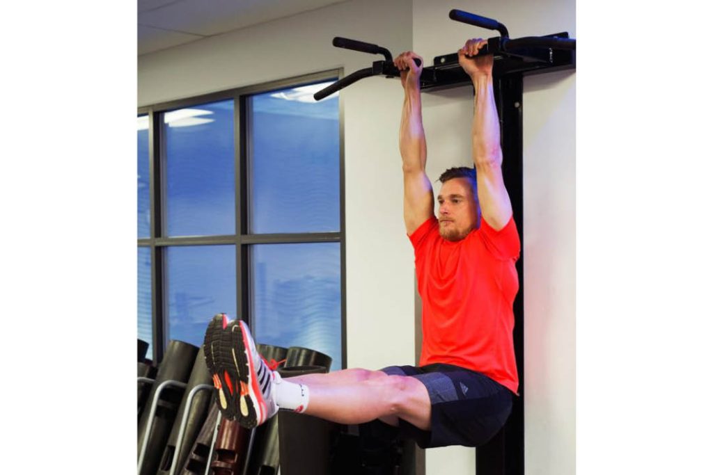 Nasıl yapılır: L-şeklinde asılı durma pozisyonunda başlayın – elleriniz pull-up barını omuz genişliğinde kavrayın ve avuç içleriniz dışarıya baksın. Her iki dizinizi de yukarı doğru çekin ve kalçalarınızla aynı yüksekliğe hizalayın.