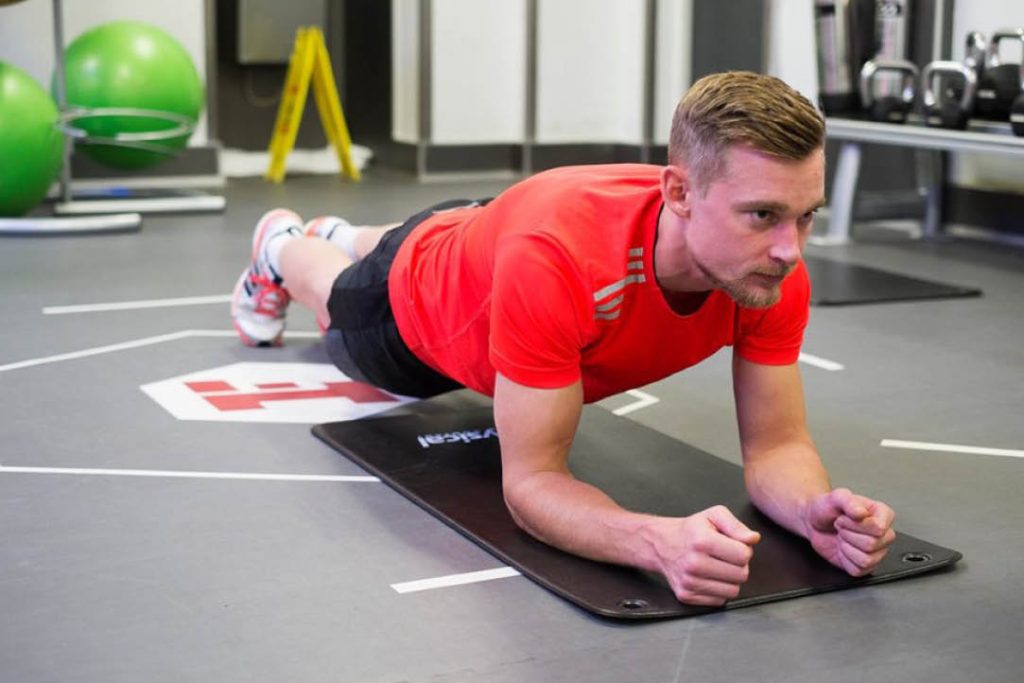 Dirsekleriniz omuzlarınızın altında ve sırtınız düz olmalıdır – vücudunuzun başınızdan ayaklarınıza kadar düz bir çizgi oluşturduğundan emin olmak için bir aynanın önünde çalışın. Plank pozisyonunu olabildiğince uzun süre (en az bir dakika) tutmayı hedefleyin.