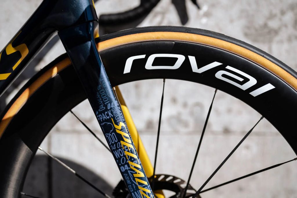 Altın renkli maşa arasında, Remco 30mm genişliğinde Specialized Turbo Cotton TLR lastikleri takılı bir çift Roval Rapide CLX III jant kullanıyor