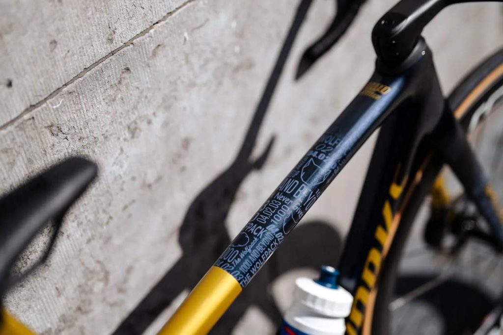 Tarmac’ın kadrosu, takımın 1000. zaferini anmak için süslenmiş durumda. Wolfpack kimliği bisiklet üzerinde ana tema olarak öne çıkıyor, tıpkı QuickStep’in 2003 Tour of Qatar’daki ilk zaferine atıfta bulunan 04.02.03 tarihi gibi.