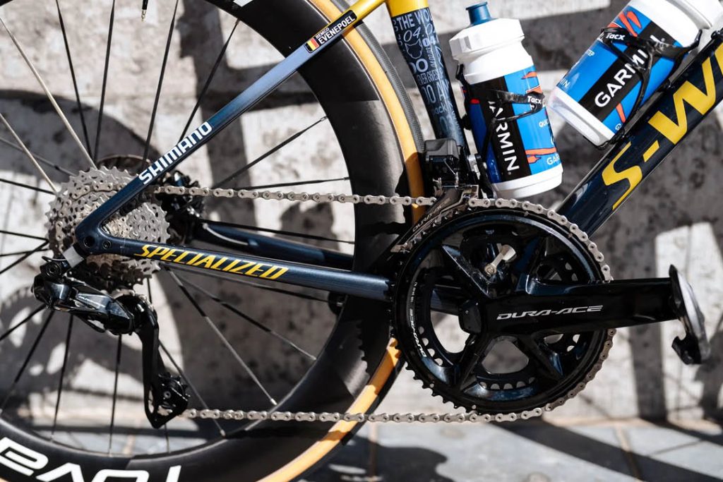 Shimano, Soudal-QuickStep’in sponsoru, bu yüzden güç ölçer ve pedallar dahil olmak üzere tam bir Dura-Ace grup seti kullanıyorlar. 1. etapta Evenepoel, 54-40t aynakol seti kullandı. Pedallara basarken Belçikalı sporcu, yeni piyasaya sürülen S-Works Remco Torch ayakkabılarını giyiyor