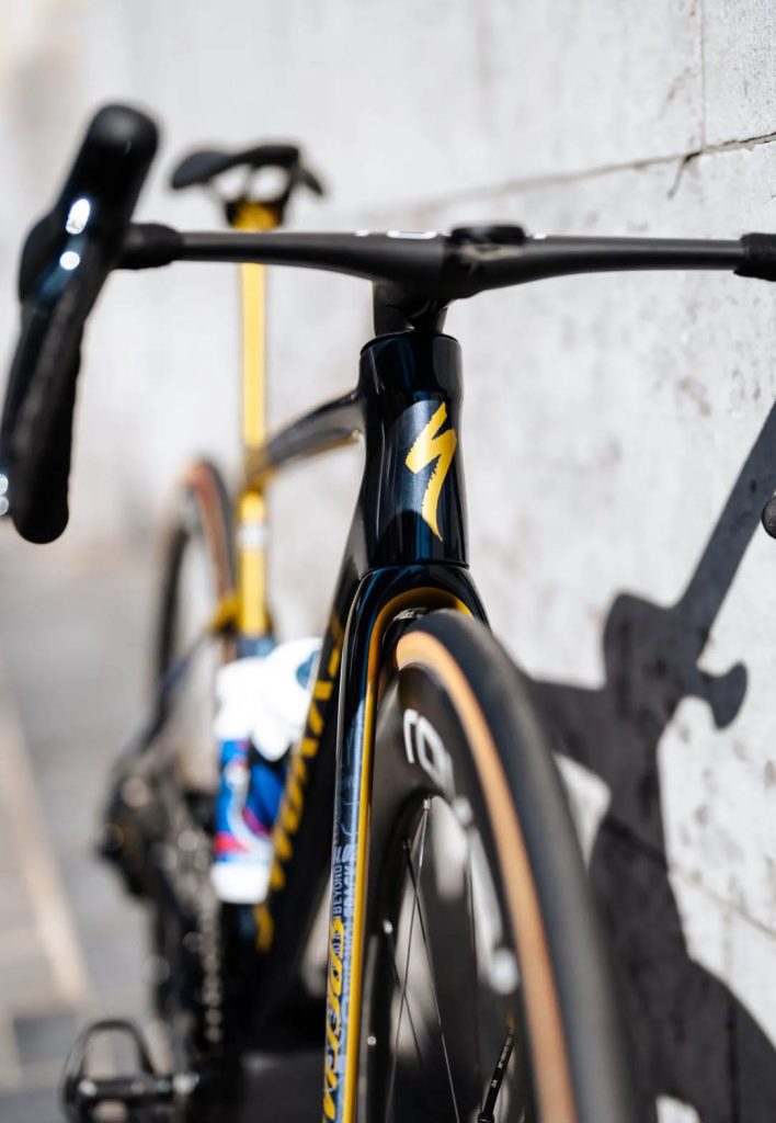 Soudal-QuickStep takımından Remco Evenepoel, Olimpiyat şampiyonluğuna yaraşır şekilde, altın kaskı ve Oakley gözlükleriyle yarışıyor. Evenepoel Tour de France’da Soudal-QuickStep’in 20 yıllık mirasına atıfta bulunan ve bolca altın rengi detaylarla süslenmiş bir Specialized S-Works Tarmac SL8 bisiklet kullanıyor.