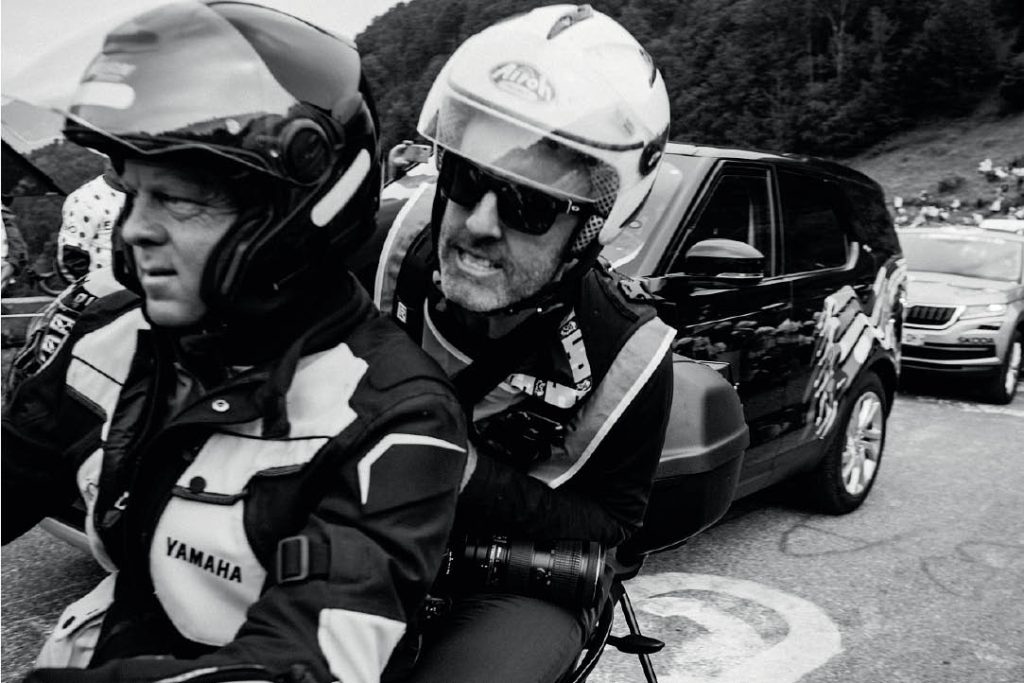 Yorumcular dramı anlatırken, fotoğrafçı Chris Auld olayı yakalamaya çalışıyor: “Bir noktada birden fazla çekim yapmaya çalışıyoruz, bu sebeple dağlık bir etapta kendinizi başka bir viraja bakan bir noktada konumlandırıyoruz, böylece bisikletçileri hem gelirken hem virajı dönerken hem de sizden uzaklaşırken çekebiliyoruz.”