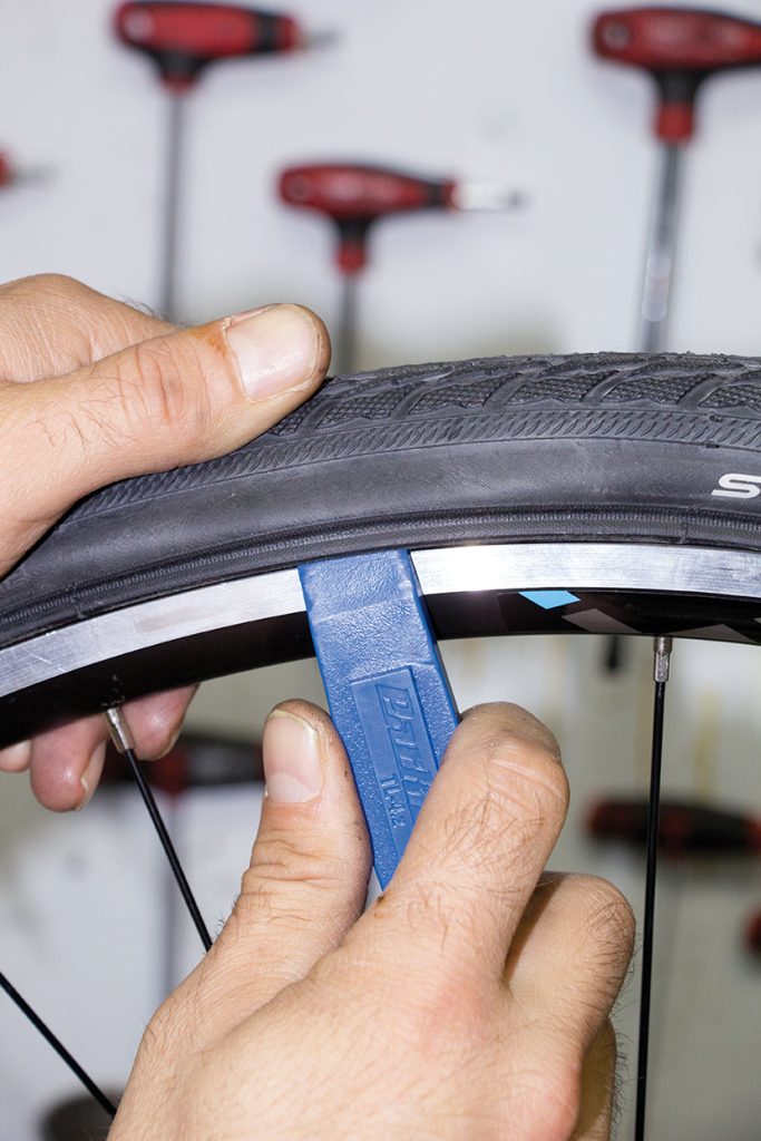 Lastiğimizi söküyoruz. İç lastiği söktükten sonra, jantın içinde basınç nedeniyle lastiği patlatmaması için bulunan jant fitilini çıkarıyoruz. Bu sayede tel başlarına müdahale edebiliyoruz.