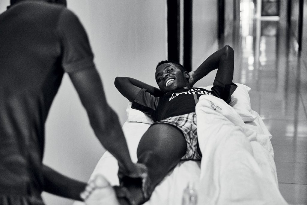 Yemeğini yedikten sonra Didier Munyaneza masaja gidiyor, bu da bize onunla sohbet etme fırsatı veriyor. Masaj masası bir otel odasının mahremiyetinde değil, aksine bir koridorda. Ama Munyaneza’nın umurunda değil. Antrenörünün “her zaman mutlu” diye tanımladığı bisikletçiden bekleyeceğiniz her şey onda var.