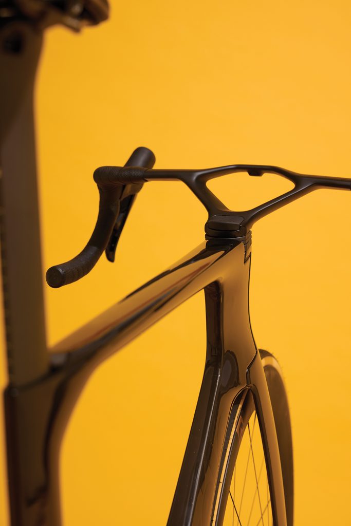 Cervélo’ya göre, maşa 53g ağırlaştı ancak yeni S5’in kadro seti genel olarak 124g daha hafif. Bu tasarruf, sele borusu başlığındaki 27g’lık değişiklik gibi küçük alanlardan ve tabii ki karbon katmanlamadaki ince ayarlardan geliyor. Ancak asıl fark, markanın trend yaratan V-Stem bazlı gidon–boğaz tasarımından kaynaklanıyor (bu konsept, iki nesil önce ilk kez S5’te tanıtıldığından beri Colnago ve Bianchi de benzer çözümler geliştirdi). Yeni kokpit, HB14 gidon ve V-Stem’i tek parça halinde birleştiriyor.