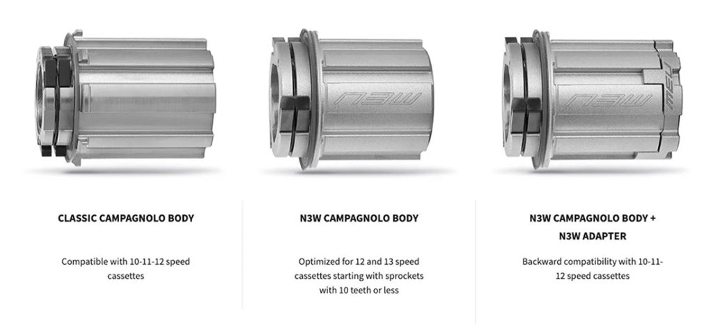 Campagnolo’nun en yeni jant setleri ise N3W adını verdiği yeni bir standart kullanır. Bu, Campagnolo’nun Ekar gravel grubu için geliştirdiği 13-vites kasetlerle uyumlu daha kısa bir freehub’dır. Ancak özel bir adaptör ile 11/12-vites Campagnolo kasetlerle de geriye dönük uyumluluk sağlar.