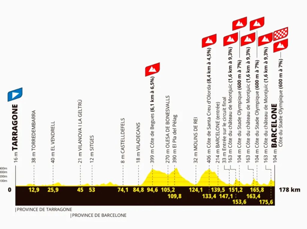 Hafif tepelik bir parkur. Barselona’daki Montjuïc (1,6km, %9,3) ve Côte du Stade Olympique (600m, %7) tırmanışlarını üç kez geçiliyor. Bu etap, erken bir genel klasman mücadelesine sahne olmaya aday.
