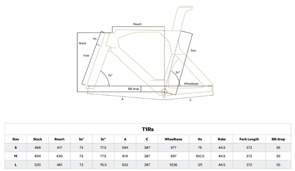 T1Rs yalnızca üç boyutta mevcuttur. Colnago, reach (uzanım) ve stack (yükseklik) ölçülerinin takip (pursuit) için optimize edildiğini belirtiyor. Nitekim ek ayarlamaların kokpit üzerinden yapılabileceğini söylüyor. Bu, orta boyda 494 mm stack ve 430 mm reach değerlerine denk gelir.