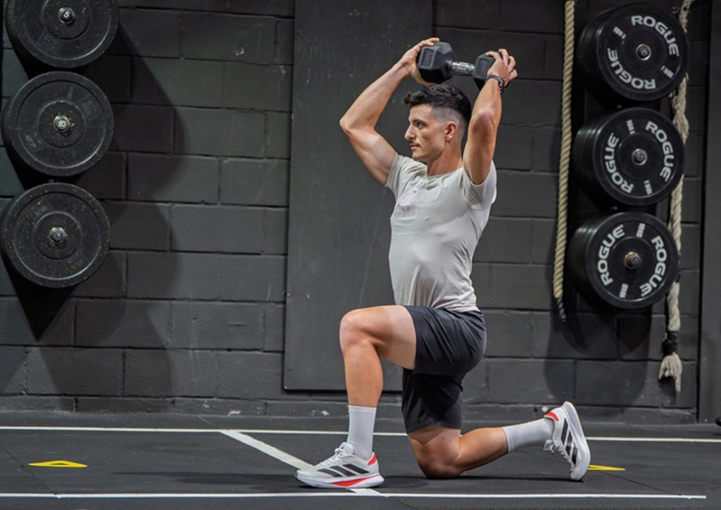 Lunge pozisyonuna gir: sağ diz yerde, sol bacak önde, her iki diz de 90°. Dambılı uçlarından tutarak çene hizasında tut. Gövdeni oynatmadan dambılı başının etrafında tam bir daire çizerek dolaştır. Her yönde 8–10 tekrar yap ve bir sonraki turda bacak değiştir.