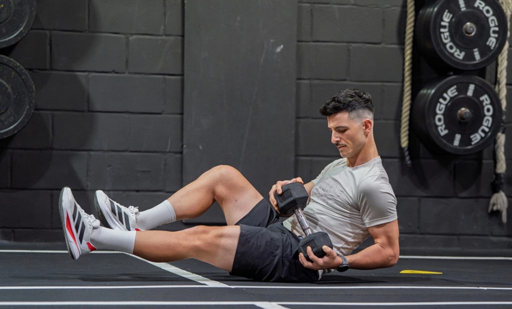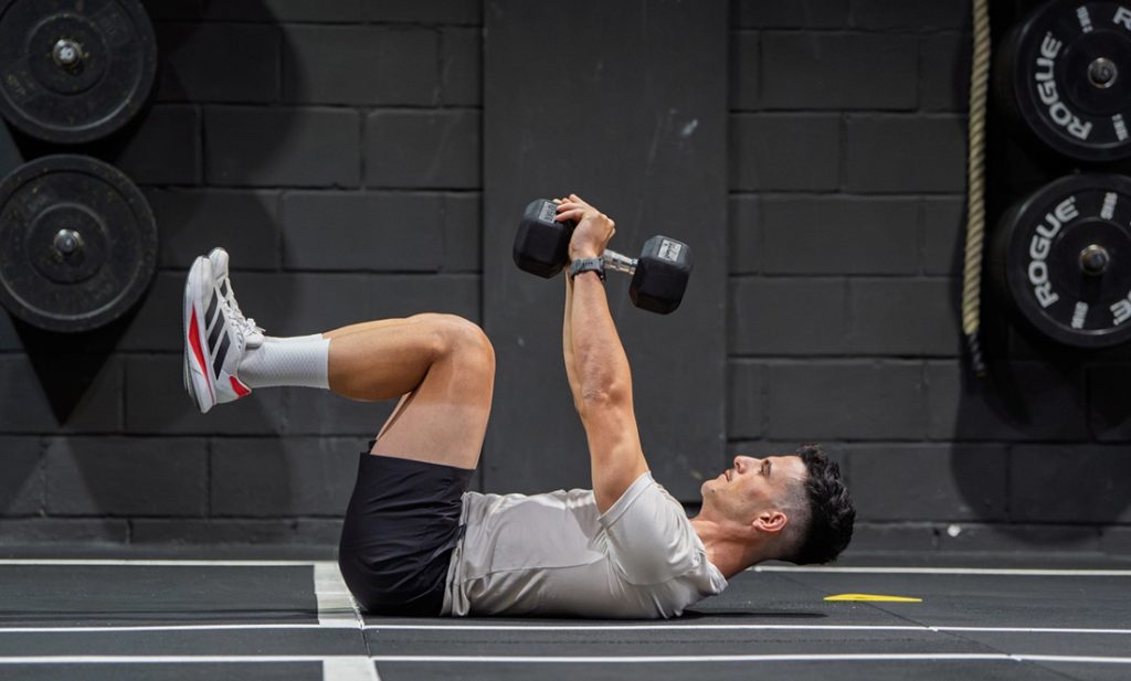 Dambılı göğsünün üzerine getirirken aynı anda crunch yap: omuzlarını yerden kaldır ve dizlerini gövdene doğru çek.