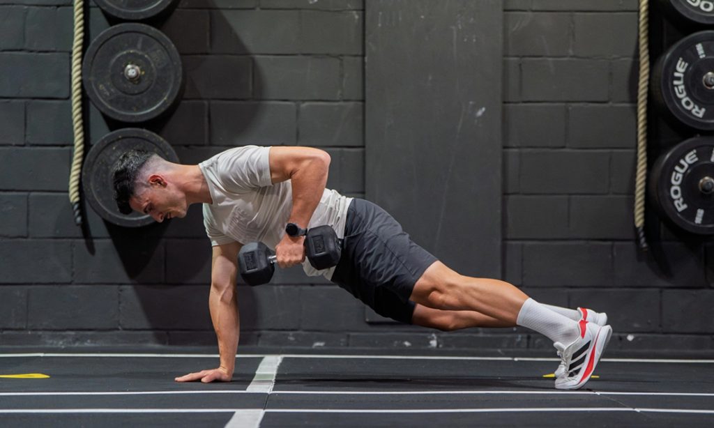 Plank pozisyonuna gir; bir elin dambılın üzerinde, diğer elin yerde olsun.