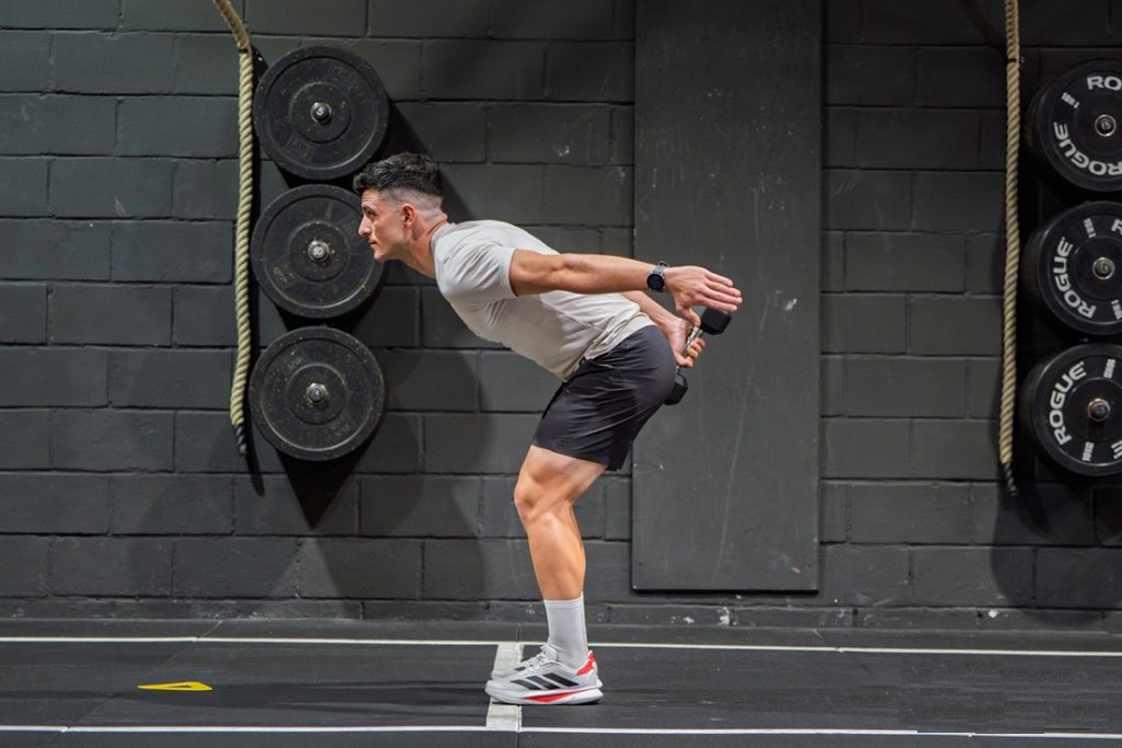 Ayakların kalça genişliğinde açık şekilde ayakta dur, dambılı tek elinde tut. Kalçadan menteşe yaparak dambılı hafifçe geriye al (küçük bir swing gibi). Kalçanı sıkarak yerden güç al ve dambılı göğüs hizasına doğru getir. Aşağı inişi kontrollü yap ve her taraf için 10–12 tekrar uygula.